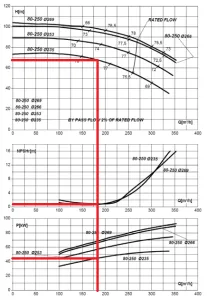 The operating point of a fire fighting station. The curve indicates the NPSH, power requirement and pressure generated (bar) at the corresponding capacity (m3/h)The point of best efficiency, sometimes also called the operating point, is the range of the pump operating curve in which the highest possible efficiency is achieved – pumping performance and pressure generated. When designing and installing a fire fightingp station, this is one of the most important parameters. Usually, such a point is reached in about 80 percent of time from the beginning of the pump’s operating curve. In order to select the most effective option, you need to know the following parameters – the fire fighting station’s performance, measured in cubic meters per hour or liters per minute, and the pressure generated, usually measured in meters of water column or bars.